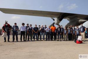 El avión Hércules de la Fuerza Aérea Argentina trasladó un contingente de 24 voluntarios de Cascos Blancos con gran experiencia en misiones internacionales en el sector de salud, encabezado por la Presidenta de la Comisión Cascos Blancos, Emb. Marina Cardelli.